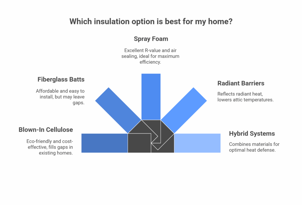For the best results, many homes benefit from combining insulation types — for example, pairing a radiant barrier with blown-in cellulose or spray foam. This layered approach tackles both conductive and radiant heat, ensuring optimal comfort and performance year-round.